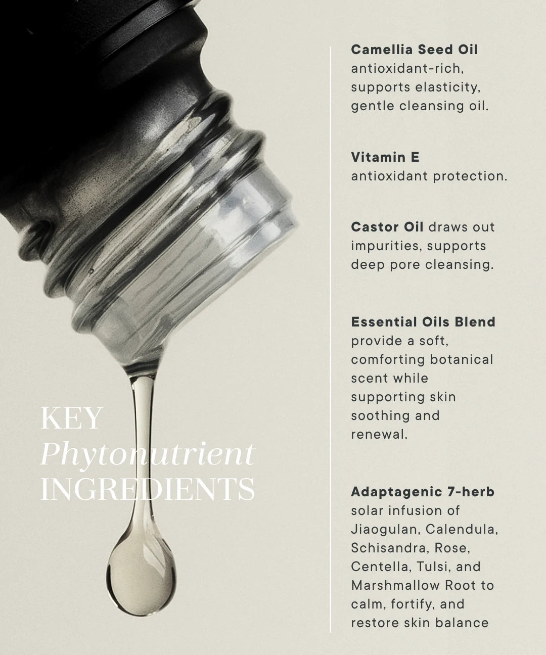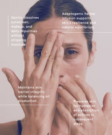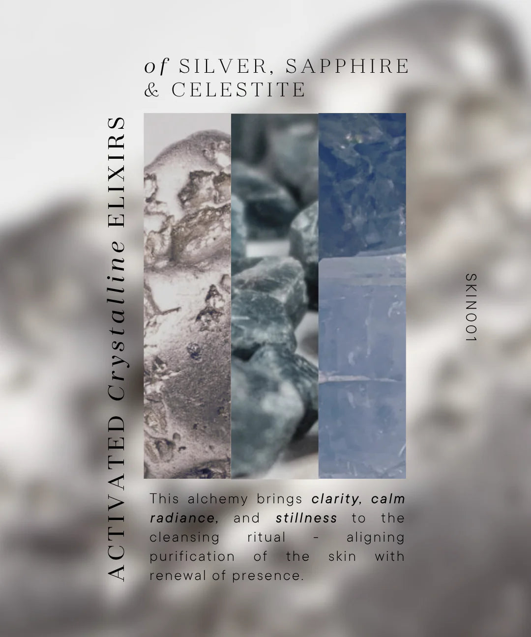 A phytonutrient-rich cleansing oil designed to dissolve impurities while maintaining the skin’s natural equilibrium. Formulated with adaptogenic herbal extracts and nourishing plant oils, it transforms into a silky milk on contact with water, leaving skin soft, clarified, and balanced. Activated with crystalline essences of Silver, Sapphire, and Celestite, it evokes stillness, clarity, and inner radiance.