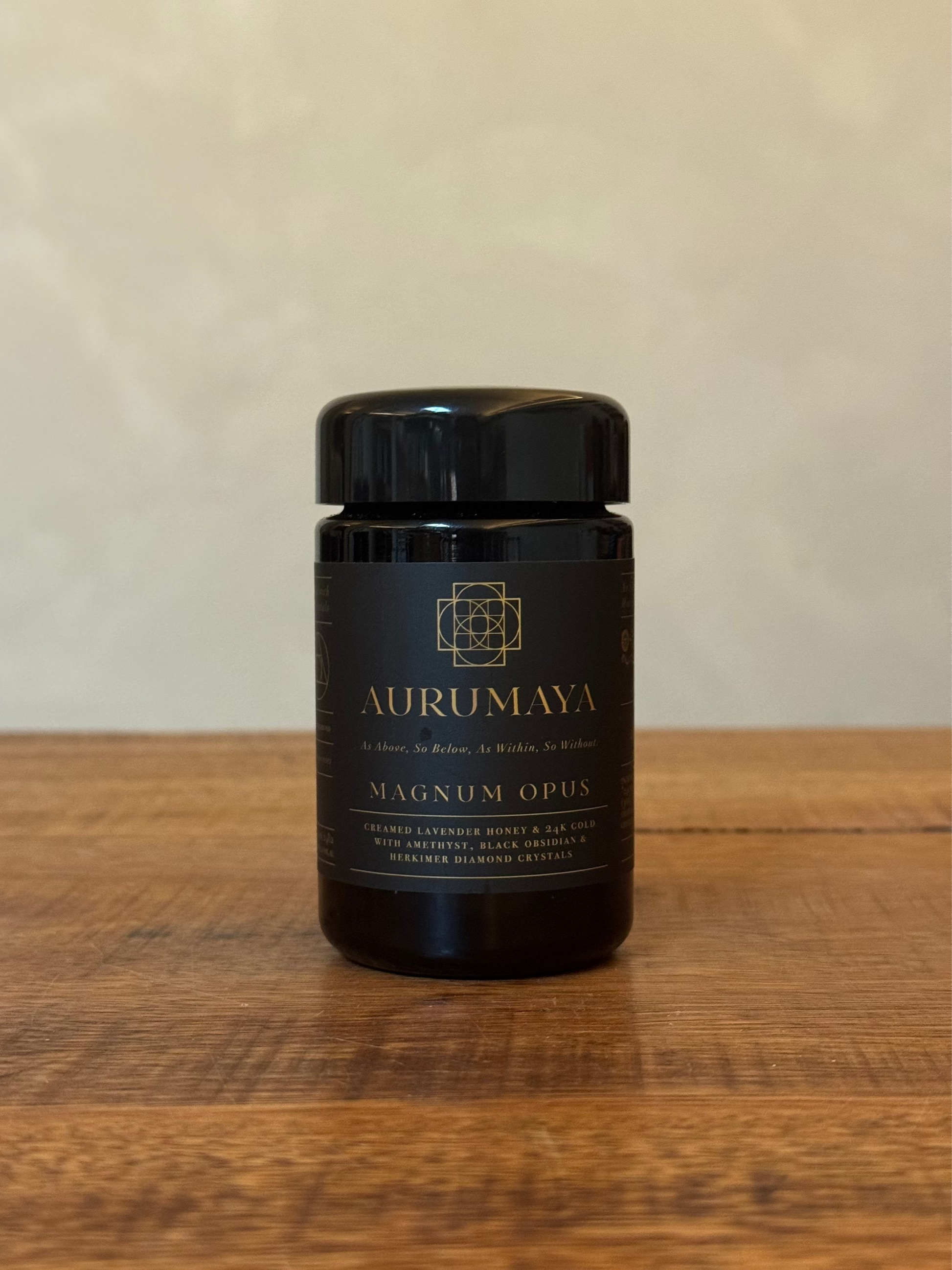 24K Monoatomic Gold (30X), High-Purity Esoteric Silver essence, Lavender Spagyric extract, Black Obsidian Crystal Essence, Amethyst Crystal Essence, Herkimer Diamond Essence suspended in whipped creamy Yellowbox & Byron Bay Hinterland MGO633+ Jellybush Honey.