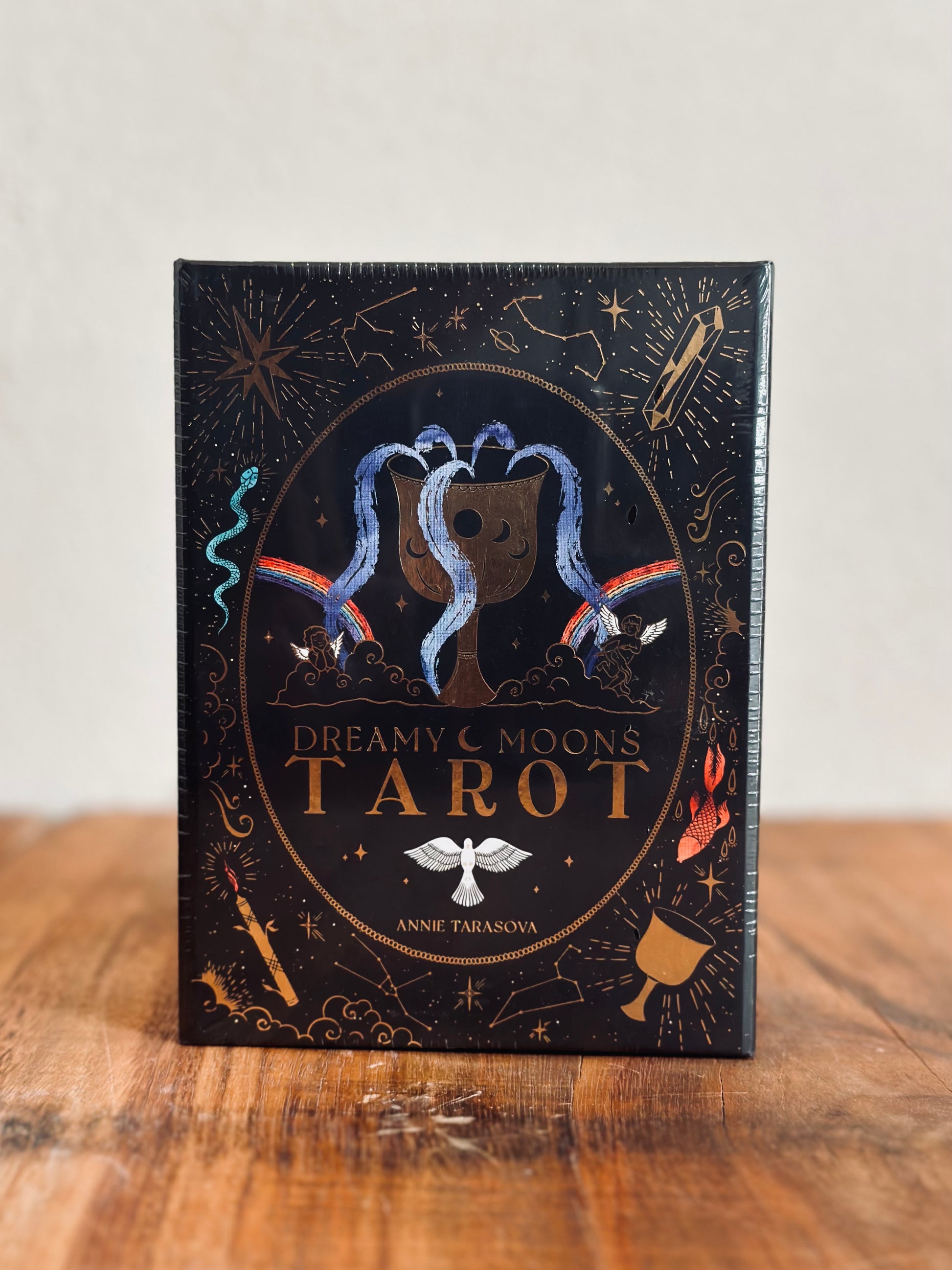 Consisting of 80 cards adorned in gold foil, this magical deck features four suits: Cups, Wands, Crystals and Stars; as well as the Major Arcanas. Paired with a 100-page detailed guidebook, this dreamy deck is an invitation to dive into your subconscious, explore your own magic and connect with the Universe that is inside and outside of you.